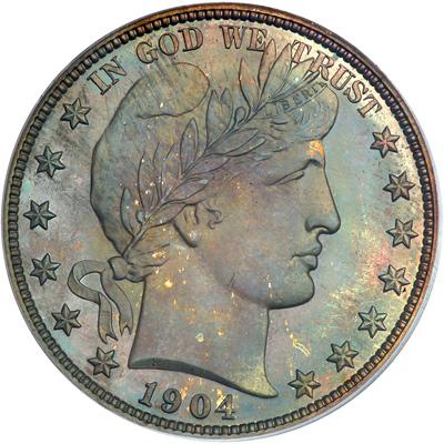 1904 Barber Half Dollar. PCGS graded Proof 67. Nice even toning. Only 670 Proofs struck. It is difficult for us to imagine a more attractively toned 1904 Proof. It is certainly an expertly struck coin, possessing as it does sharp detail on even the smallest intricate elements of Liberty's design and the eagle's wings and shield. The finish imparted by the dies is no less laudable. As a whole, the Proof 1904 is a well-produced issue, and many survivors exhibit one or both of these characteristics. What truly sets this coin apart, therefore, is the unswerving high quality of surface preservation. Could it have been hand selected right after striking and subsequently preserved with extreme care? We think so. It has the looks of it. Superb! Pop 8; none finer at PCGS (PCGS # 6551) .