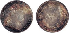 1904. Both ICCS and PCGS graded Mint State-65. An outstanding Edward ten cents piece, with great ‘eye appeal’. Light golden and amber toning, with touches of purple-blue and a strong strike over superb satin fields result in a superb gem. Tied for the second ‘Finest’ graded by PCGS.