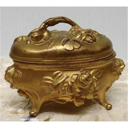 GORGEOUS JEWELRY BOX, MADE FROM WHAT IT SEEMS CAST METAL,AND SIGNED ON THE BOTTOM B&W # 179 PAT. 4-4-04, FINISHED IN GOLD ORIGINAL PATINA, THIS BOX IS MADE EARLY 1900's IN ART NOUVEAU STYLE, LOVE THE RAISED ROSES, LEAVES AND BUDS,AND IT STANDS ON 4 CURVED FEET,EXCELLENT CONDITION, NO CHIPS OR CRACKS,ORIGINALY IT MIGHT HAVE BEEN LINED,IT IS NOT NOW, BUT IT IS EASY TO INSERT THE LINING,WONDERFUL ANTIQUE PIECE TO GRACE YOUR DRESSER!MEASURES ABOUT 4 1/2" HIGH X 6" LONG AND 4" WIDE,US Buyer to pay 9.00 (heavy) for shipping plus insurance.thanks.