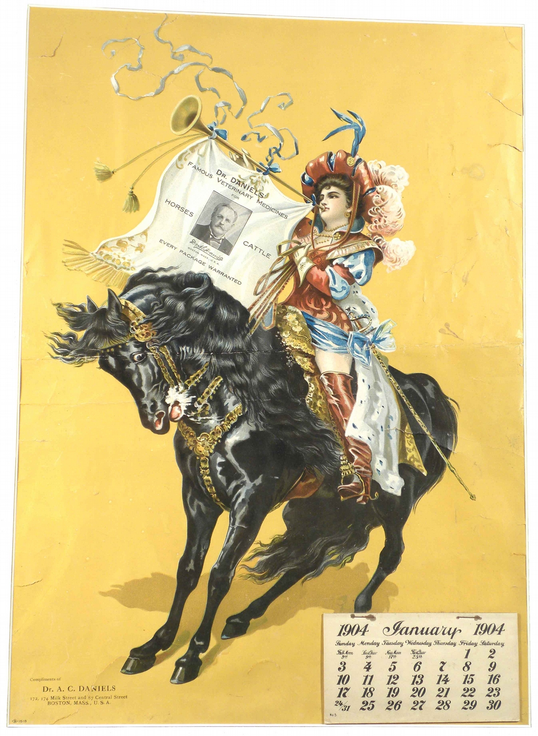 1904 Calendar Compliments Dr. A.C. Daniels. Full pad. Tear throughout, fair condition. 15 X 21 inches image only.