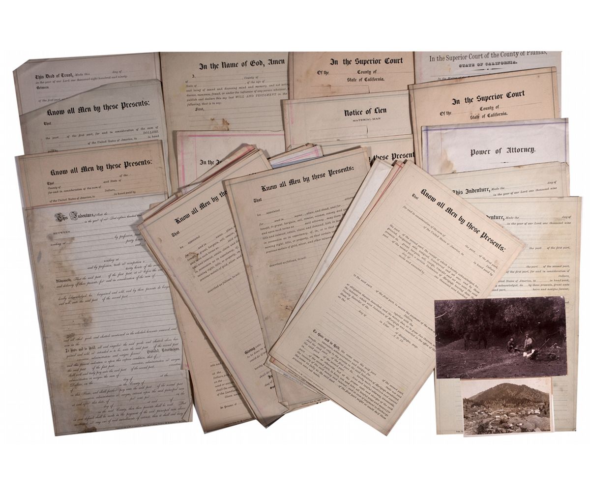 This lot consists of several sets of court documents, most are blank and include Chattel Mortgages, Assignment of Lease, an Affidavit for Publication of Summons, Satisfaction of Mortgage, Last Will and Testament and others. Also included is an unfinished handwritten letter from a husband to his wife, telling her that his court case has been delayed, a cover postmarked Gibsonville and addressed to a San Jose address from a San Jose address, a 5" x 8" black and white photo of two men at a campsite with a grazing horse and their dog, three blank promissory notes and a post card with a black and white birds eye view of Downieville, California. Back of card is blank. All the material is in good to very good condition. -58885