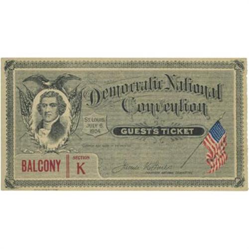 <B>1904 St. Louis Democratic National Convention Guest's Ticket.</B></I> 5 x 2.75, printed on both sides, printed by Bentley, Murray & Company, Chicago, with a portrait of Thomas Jefferson on the obverse and the Missouri State Building on the reverse. The 1904 Democratic National Convention was held in St. Louis from July 6 to July 9, 1904. The convention resulted in the nomination of Alton B. Parker for president and Henry G. Davis for vice president. The Parker/Davis ticket was soundly beaten by the incumbent Theodore Roosevelt. Very good condition. <BR><BR><b>Shipping:</b> Flat Material, Small (<a target="_blank" href="http://www.heritageauctions.com/common/shipping.php">view shipping information</a>)