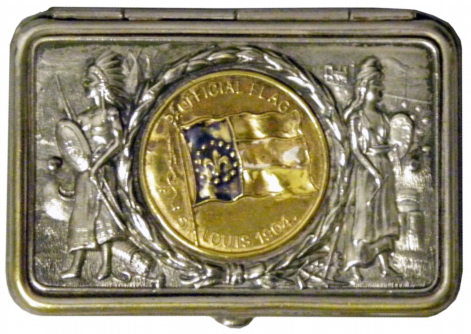 1904 Embossed Match Safe. Depicting Native American and gold coin center with Official Flag St. Louis 1904. Excellent condition. 2 3/8 X 1 3/4 inches.