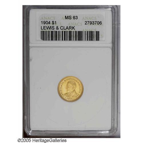 <B>1904<G$1> Lewis and Clark MS63 ANACS.</B></I> Bright yellow-gold surfaces give off a partial prooflike appearance. A few wispy slidemarks, along with some mint-made die striations, are noted in the fields. <BR><I>From The Lexington Collection.</B></I>