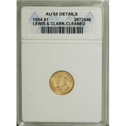 <B>1904 G$1 Lewis and Clark--Cleaned--ANACS. AU55 Details.</B></I> NGC Census: (7/1025). PCGS Population (33/1696). Mintage: 10,025. Numismedia Wsl. Price for NGC/PCGS coin in AU55: $730. (#7447)<BR><BR><b>Shipping:</b> Coins & Currency (<a target="_blank" href="http://www.heritageauctions.com/common/shipping.php">view shipping information</a>)