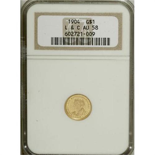 <B>1904 G$1 Lewis and Clark AU58 NGC.</B></I> The borders are lustrous, and the lightly abraded fields and portraits exhibit only a whisper of friction. The only two-headed commemorative type.<BR><BR><b>Shipping:</b> Coins & Currency (<a target="_blank" href="http://www.heritageauctions.com/common/shipping.php">view shipping information</a>)