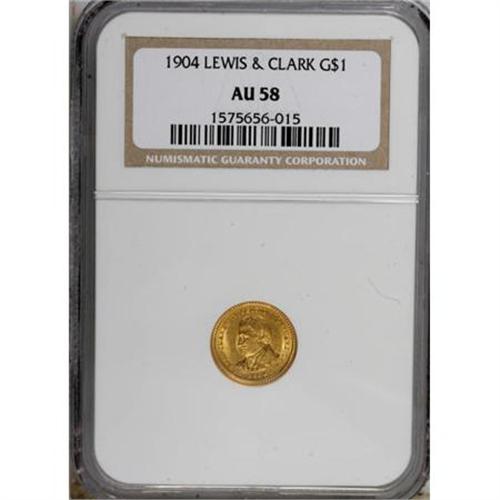 <B>1904 G$1 Lewis and Clark AU58 NGC.</B></I> NGC Census: (36/989). PCGS Population (94/1598). Mintage: 10,025. Numismedia Wsl. Price for NGC/PCGS coin in AU58: $745. (#7447)<BR><BR><b>Shipping:</b> Coins & Currency (<a target="_blank" href="http://www.heritageauctions.com/common/shipping.php">view shipping information</a>)
