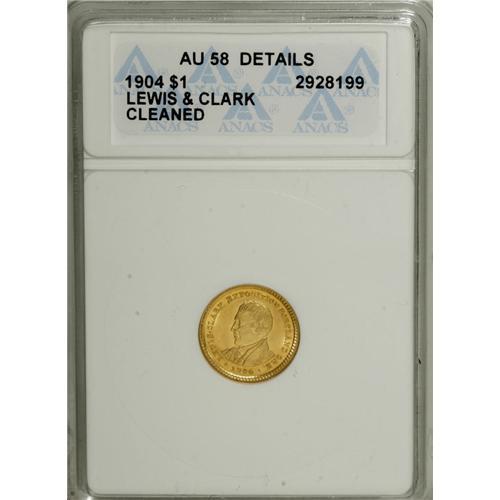 <B>1904 G$1 Lewis and Clark--Cleaned--ANACS. AU58 Details.</B></I> Well struck with lovely, rich coloration and few minor abrasions and pinscratches on each side. Some wispy hairlines in the fields are evidence of an improper cleaning long ago.<BR><BR><b>Shipping:</b> Coins & Currency (<a target="_blank" href="http://www.heritageauctions.com/common/shipping.php">view shipping information</a>)