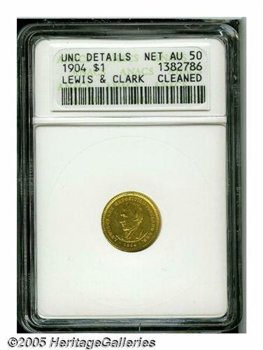 <B>1904<G$1> Lewis and Clark--Cleaned--ANACS. Unc Details, net AU50.</B></I> A slightly subdued example of this popular gold Commemorative. Wispy hairlines appear when observed under a glass.