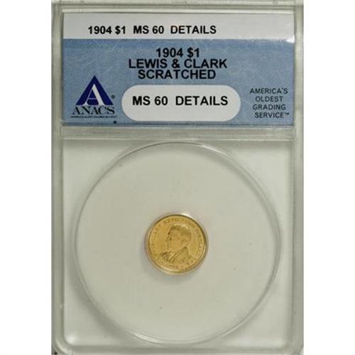 <B>1904 G$1 Lewis and Clark--Scratched--ANACS. MS60 Details.</B></I> NGC Census: (8/1004). PCGS Population (18/1605). Mintage: 10,025. Numismedia Wsl. Price for NGC/PCGS coin in MS60: $1,060. (#7447)<BR><BR><b>Shipping:</b> Coins & Currency (<a target="_blank" href="http://www.heritageauctions.com/common/shipping.php">view shipping information</a>)