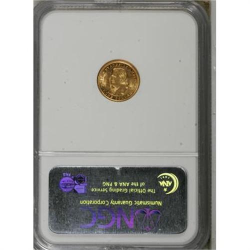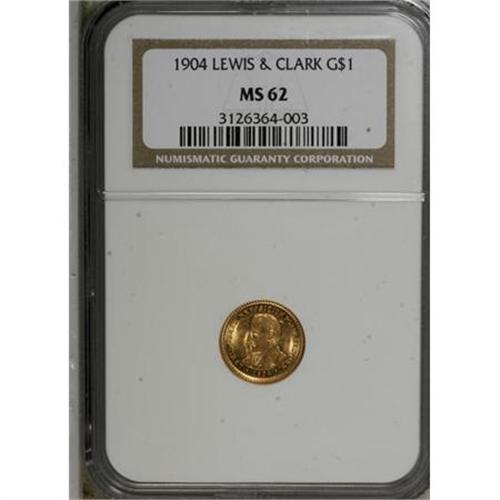 <B>1904 G$1 Lewis and Clark MS62 NGC.</B></I> A lustrous, pleasing example of this early commemorative gold dollar that seems conservatively graded. An interesting orange-peel texture (as struck) occurs near the peripheral letters, but abrasions are virtually absent on both sides. <BR><BR><b>Shipping:</b> Coins & Currency (<a target="_blank" href="http://www.heritageauctions.com/common/shipping.php">view shipping information</a>)