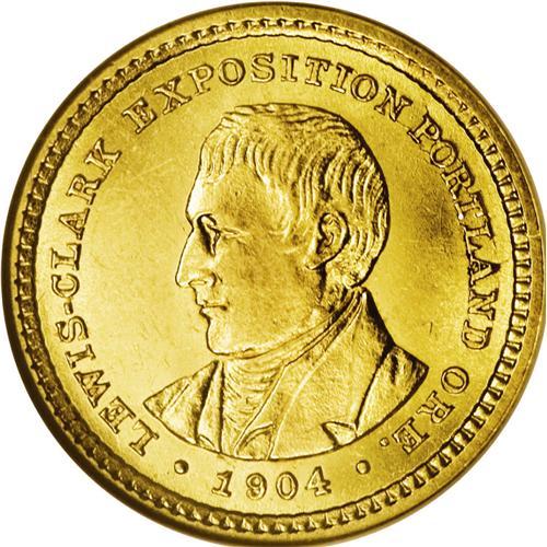 <B>1904<G$1> Lewis and Clark MS63 NGC.</B></I> This flashy, semi-prooflike example reveals unusually crisp design details, especially on the hair detail of Mr. Clark. Wispy hairlines in the obverse and reverse fields limit the grade but do little harm to the visual appeal of this bright gold dollar.