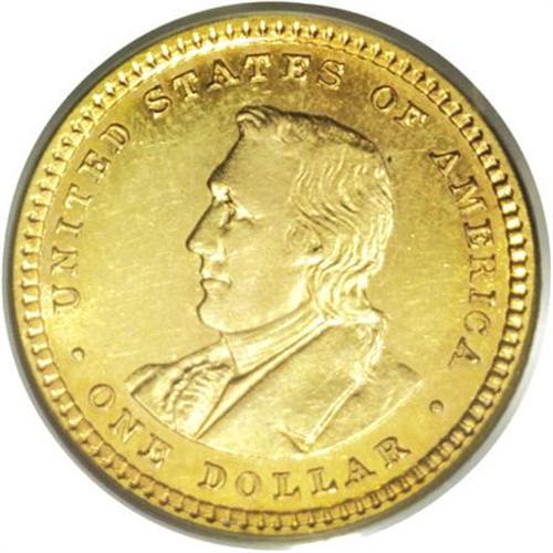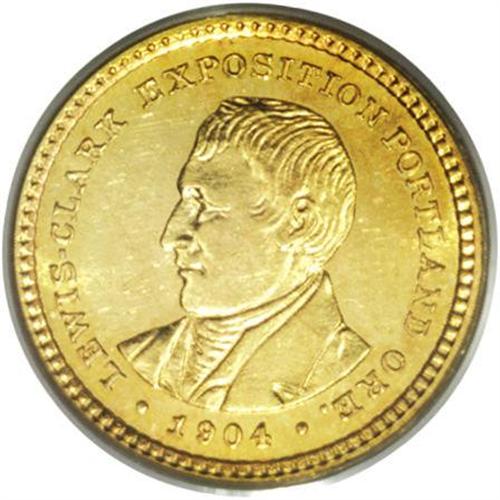<B>1904<G$1> Lewis and Clark MS63 PCGS.</B></I> The 1903 and 1904 Lewis and Clark issues are about equally rare in MS63, but in higher grades the 1904 issue becomes progressively more elusive. This piece offers pretty sunset-gold surfaces with good luster. Light chatter in the fields on each side is noted, but there are no singularly distracting marks.