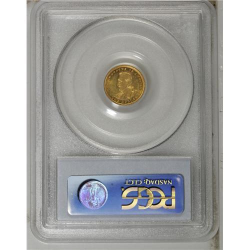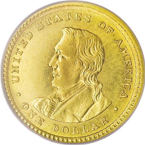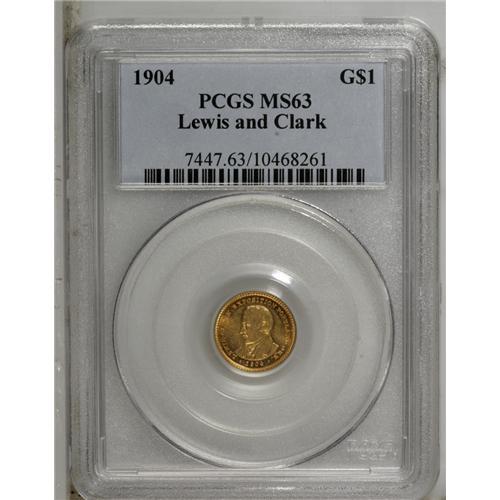 <B>1904<G$1> Lewis and Clark MS63 PCGS.</B></I> This issue has a reputation for being poorly struck, but the current example displays very good detail on both of the portraits, save for minor flatness on Clark's ear and upper hair curls. The luster is bright and attractive, and the deep orange-gold and green toning is also quite appealing. A small abrasion is noted on the cheek of Mr. Lewis, very close to the nose.