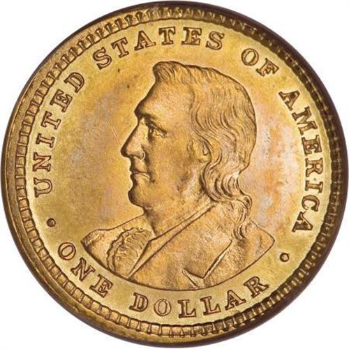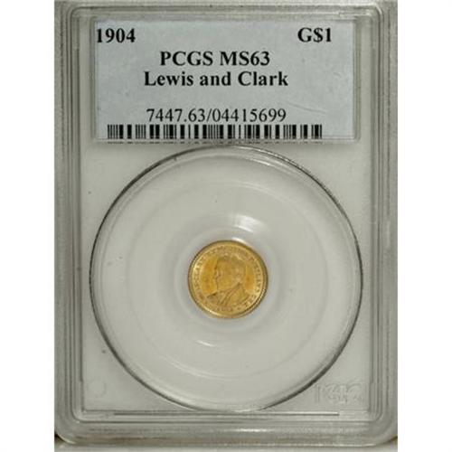 <B>1904 G$1 Lewis and Clark MS63 PCGS.</B></I> Both sides display a pleasing, concentric blend of reddish-gold and olive patina, with just a bit of haziness noted about the portrait of Captain Clark. Most of the grade-limiting disturbances, however, appear in the form of squiggly facial marks on Thomas Jefferson's choice to lead the expedition, Meriwether Lewis.<BR><BR><b>Shipping:</b> Coins & Currency (<a target="_blank" href="http://www.heritageauctions.com/common/shipping.php">view shipping information</a>)