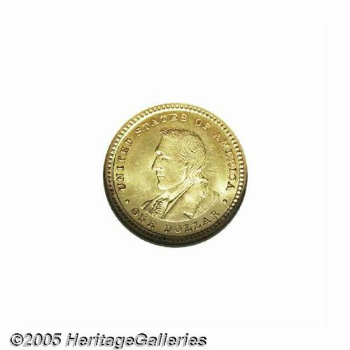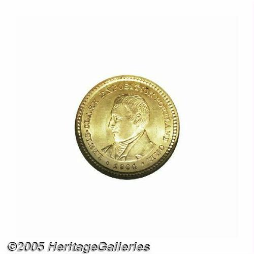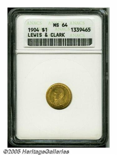 <B>1904<G$1> Lewis and Clark MS64 ANACS.</B></I> Sharply struck and satiny, with full remaining luster, this Choice Mint State example has a curving mark in the left reverse field and a tiny green spot of verdigris, also on the side at the lower rim. Well preserved and pleasing to the eye with ample, bright honey-golden color.