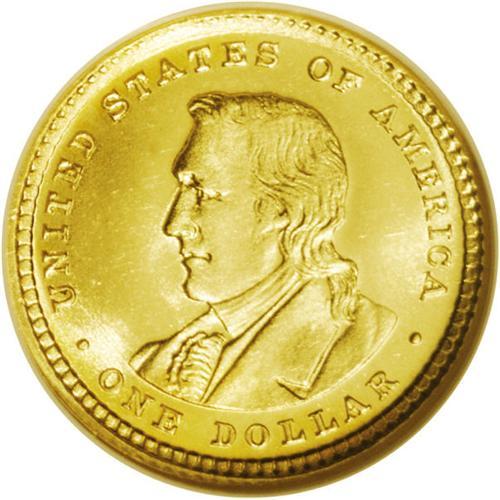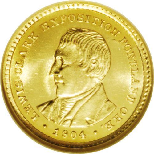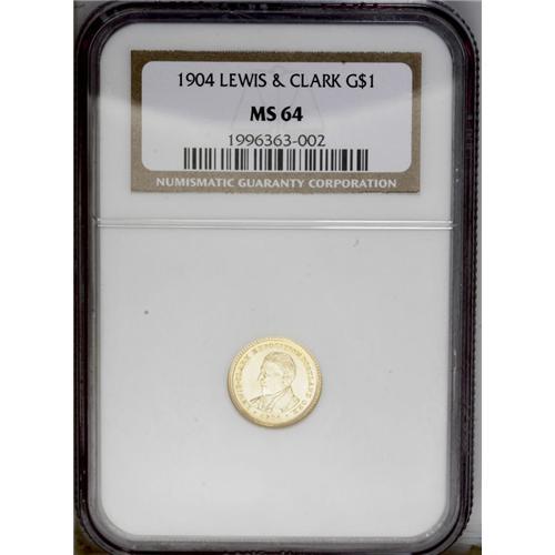 <B>1904<G$1> Lewis and Clark MS64 NGC.</B></I> A near-Gem example that may deserve the higher grade, although a few faint hairlines can be seen on each side. It has satiny, nearly reflective fields and lustrous yellow-gold devices, creating an excellent Cameo appearance. This one has the eye appeal of a higher grade.