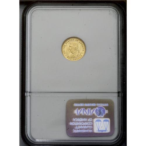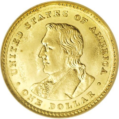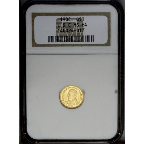 <B>1904<G$1> Lewis and Clark MS64 NGC.</B></I> David Bowers (1991) notes that most examples of Lewis and Clark gold dollars show evidence of handling. The bright yellow-gold surfaces of the specimen offered here reveal a few inoffensive slide marks, and possess occasional areas of "orange-peel" texture. Pleasing luster is exuded from each side, and the design elements are sharply impressed. An exceptionally nice near-Gem.