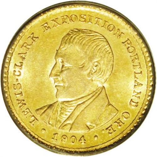 <B>1904<G$1> Lewis and Clark MS64 PCGS.</B></I> A bright yellow-gold example with hints of steel-blue on the portrait highpoints. Luster is especially ebullient throughout the borders. Sales of the 1904 and 1905 Lewis and Clark dollars helped finance a Portland, Oregon, bronze memorial of Sacagawea. Encapsulated in a green label holder.