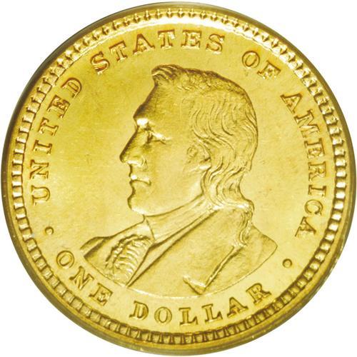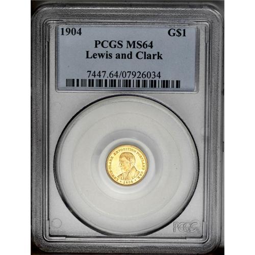 <B>1904<G$1> Lewis and Clark MS64 PCGS.</B></I> A couple of faint contact marks on the portrait of Meriwether Lewis are all that separate this piece from a full Gem classification. The fields are exceptionally bright and lustrous, and the coin displays rich orange-gold coloration about the borders.