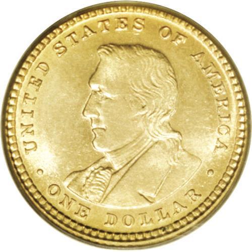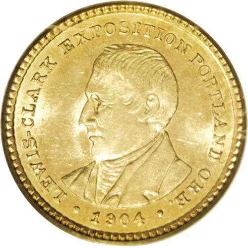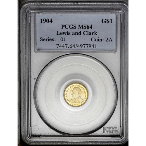 <B>1904<G$1> Lewis and Clark MS64 PCGS.</B></I> Flashy luster and attractive with a touch of central haze. Faint hairlines are found over the surfaces, but are visible only at certain angles. The usual light die crack through the final A of AMERICA is present. <BR><BR><B>Important notice:</B> Heritage usually auctions material at the rate of 200-250 lots per hour. On some occasions eBay Live bid software or the Internet may not be able to keep up with the pace of the auction. We recommend placing a realistic absentee bid now as insurance to avoid disappointment. Occasionally the auctioneer may eliminate or reject an eBay Live bid, and the auctioneer may also reopen a lot after the close of the eBay live bidding (usually because we missed an audience bid), and may reject your bid even if it shows you as the winning bidder. By bidding via eBay Live, you agree that Heritage may award the lot to another bidder at its sole discretion under the circumstances described above or any other reasonable circumstances. Since eBay bids are not shown to us until we open the lot on the floor, we treat those bids just like floor bids. In most cases the floor responds before the eBay bid is presented to us, due to Internet lag time, so for consistency we have made it a policy that floor bids are always considered first over tie eBay live bids. Also please note that all Heritage lots purchased through eBay Live carry a 20% Buyer's Premium. Please make sure you read the Terms and Conditions before you bid. This lot is being auctioned in conjunction with a live floor auction by Heritage Galleries & Auctioneers. All final auction and invoice information will be supplied by Heritage Galleries & Auctioneers, and all other information should be considered preliminary. Lot:5153 <BR><BR><B>Winning Notification and Billing:</B> After the FINAL session in this auction is complete, Heritage will send e-mail and snail mail invoices. This process normally takes several days. All final auction and invoice information will be supplied by Heritage Galleries & Auctioneers, and all other information should be considered preliminary. <BR><BR>This auction will be conducted on a live auction floor and over the Internet through eBay Live. If you choose to place an absentee bid, please take a moment to <font color='#0000ff'><u><a href='http://pages.ebay.com/liveauctions/help/before/laabsentee.html'>learn how eBay Live absentee bidding works</a></u></font><font color='#000000'>