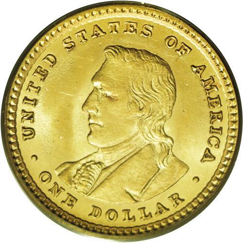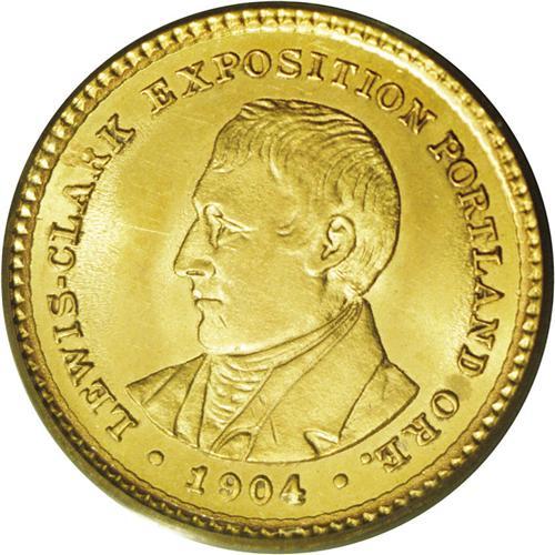 <B>1904<G$1> Lewis and Clark MS64 PCGS.</B></I> Highly lustrous surfaces display attractive yellow-gold patination with light greenish undertones. The design elements are sharply impressed throughout. The grade is limited by a few small linear abrasions on the obverse portrait, and by several wispy hairlines over each side.