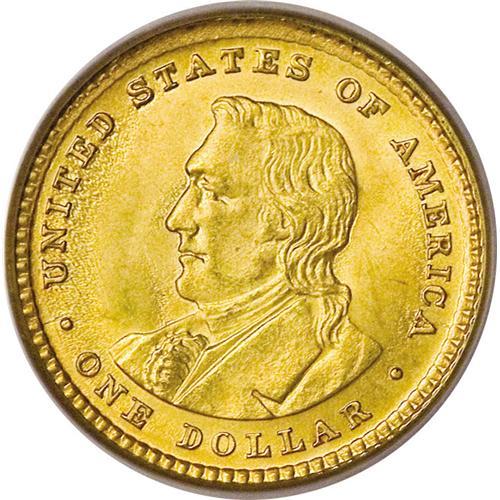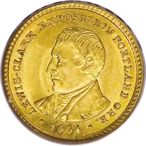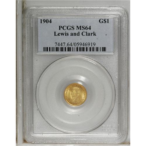 <B>1904 G$1 Lewis and Clark MS64 PCGS.</B></I> This example has the look of a Gem specimen at first glance, and only close inspection reveals the minor blemishes that keep it below that grade level. Both sides have subdued mint frost with brilliant lemon-yellow color and sharp striking details.<BR><BR><b>Shipping:</b> Coins & Currency (<a target="_blank" href="http://www.heritageauctions.com/common/shipping.php">view shipping information</a>)