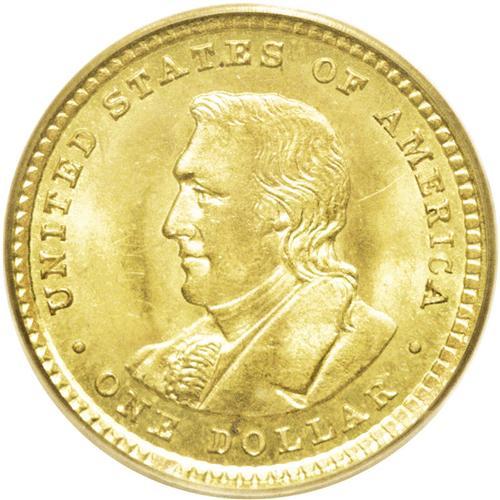<B>1904<G$1> Lewis and Clark MS64 PCGS.</B></I> While the Lewis (obverse) side has softly frosted, satiny surfaces, the Clark (reverse) side shows considerable prooflikeness, and both sides display lovely greenish-gold and orange-gold surfaces. Excellent luster radiates from both sides. Certified in a green-label holder.