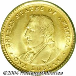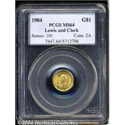 <B>1904<G$1> Lewis and Clark MS64 PCGS.</B></I> Bright and lustrous with a reddish-golden appearance and some metal flow noted on each side. A noticeable, vertical lintmark (as struck) is noted on Mr. Clark's face on the reverse. <BR><BR><B>Important notice:</B> Heritage usually auctions material at the rate of 200-250 lots per hour. On some occasions eBay Live bid software or the Internet may not be able to keep up with the pace of the auction. We recommend placing a realistic absentee bid now as insurance to avoid disappointment. Occasionally the auctioneer may eliminate or reject an eBay Live bid, and the auctioneer may also reopen a lot after the close of the eBay live bidding (usually because we missed an audience bid), and may reject your bid even if it shows you as the winning bidder. By bidding via eBay Live, you agree that Heritage may award the lot to another bidder at its sole discretion under the circumstances described above or any other reasonable circumstances. Since eBay bids are not shown to us until we open the lot on the floor, we treat those bids just like floor bids. In most cases the floor responds before the eBay bid is presented to us, due to Internet lag time, so for consistency we have made it a policy that floor bids are always considered first over tie eBay live bids. Also please note that all Heritage lots purchased through eBay Live carry a 20% Buyer's Premium. Please make sure you read the Terms and Conditions before you bid. </span></font></tr></table></td></tr></table>
