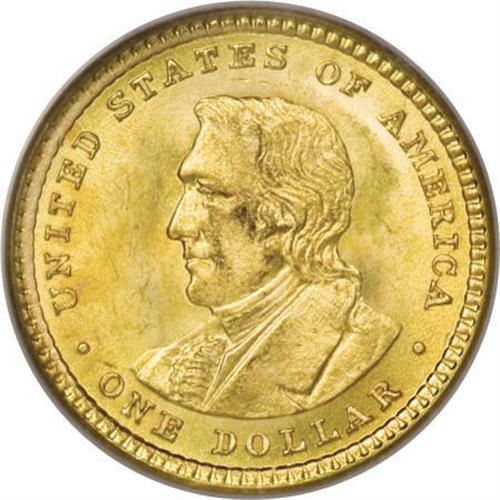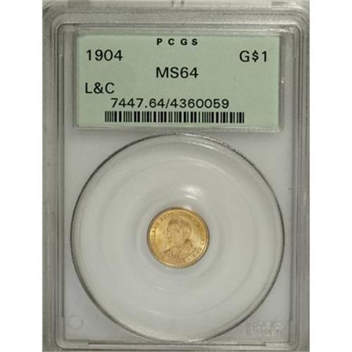 <B>1904 G$1 Lewis and Clark MS64 PCGS.</B></I> Struck to commemorate the 1804 Lewis and Clark expedition, an even that was also commemorated in 2004 on U.S. coinage. The surfaces are moderate yellow-gold with a couple of tiny luster grazes in the fields, but much luster remains nonetheless. Certified in a green-label holder.<BR><BR><b>Shipping:</b> Coins & Currency (<a target="_blank" href="http://www.heritageauctions.com/common/shipping.php">view shipping information</a>)