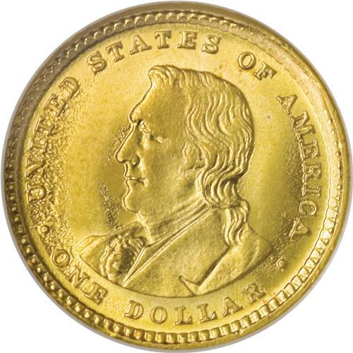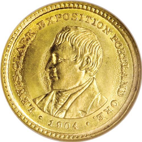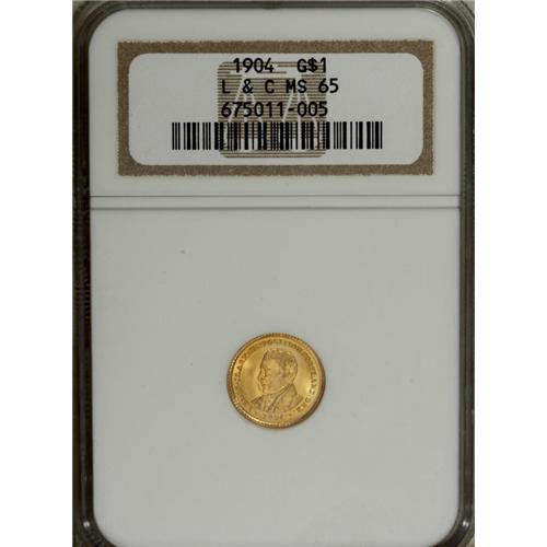 <B>1904 G$1 Lewis and Clark MS65 NGC.</B></I> First and most frequently found of the two Lewis and Clark issues, this piece shows bright orange-gold color and just a hint of semi-prooflikeness in the fields. Sharply defined and notably free from abrasions, this is a superior gold commemorative.<BR><BR><b>Shipping:</b> Coins & Currency (<a target="_blank" href="http://www.heritageauctions.com/common/shipping.php">view shipping information</a>)