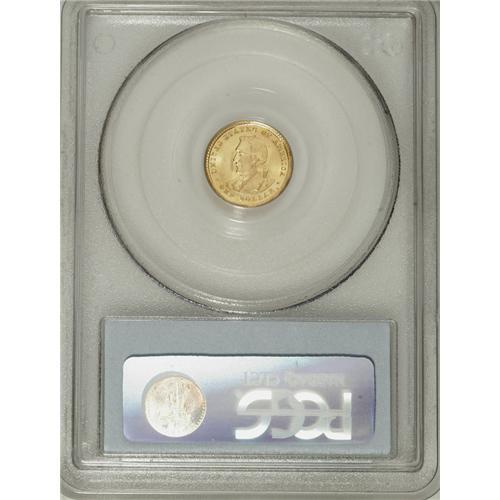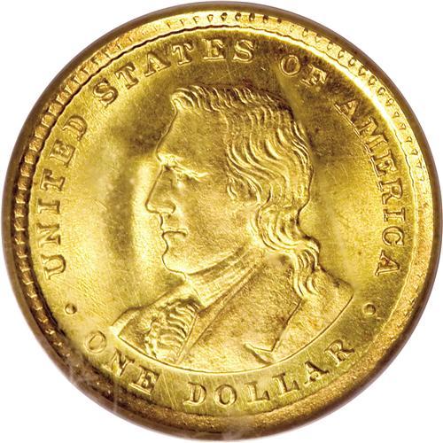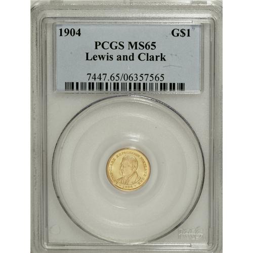 <B>1904 G$1 Lewis and Clark MS65 PCGS.</B></I> The classic gold commemoratives, which range from gold dollars to fifty dollar pieces, have lower mintages than most silver commemoratives, with the lone possible exception of the Sesquicentennial quarter eagle of 1926. Among the gold dollar commemorative issues, the Lewis and Clark coins of 1904 rank among the most elusive pieces, especially in Gem grades. Both sides of this lovely yellow-gold Gem have satiny luster with sharp detail and only insignificant marks that are compatible with the grade. A delightful survivor.<BR><BR><b>Shipping:</b> Coins & Currency (<a target="_blank" href="http://www.heritageauctions.com/common/shipping.php">view shipping information</a>)