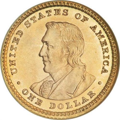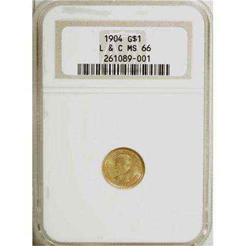 <B>1904 G$1 Lewis and Clark MS66 NGC.</B></I> Two events celebrated on classic American commemoratives have echoes in the modern era. In 1992, a three-coin set celebrated the quincentenary of the first voyage of Christopher Columbus to the New World, echoing the quarter and half dollars issued for the World's Fair that celebrated that event's 400th anniversary. In 2004, a silver dollar honored the Lewis and Clark expedition bicentennial, which has a classic-era echo in the Lewis and Clark gold dollars of 1904 and 1905.<BR> This Premium Gem hails from the former issue, slightly more available in the numismatic marketplace than its 1905 counterpart but a challenge nonetheless. The canary-yellow and sun-gold surfaces offer unusually vibrant luster, and the strike is uncommonly sharp. Beautifully preserved overall with magnification required to perceive the few minuscule flaws in the fields. NGC has graded 23 finer examples (11/07).<BR><I>From The Pinetop Collection.</B></I><BR><BR><b>Shipping:</b> Coins & Currency (<a target="_blank" href="http://www.heritageauctions.com/common/shipping.php">view shipping information</a>)