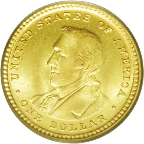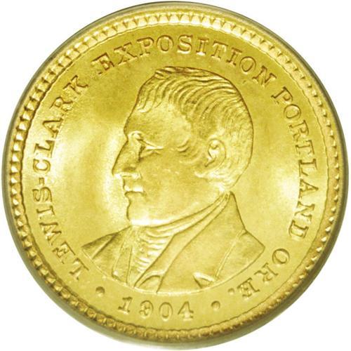 <B>1904<G$1> Lewis and Clark MS66 PCGS.</B></I> Farran Zerbe was the man when it came to commemorative gold coinage issues. He played a role in nearly every such coin, especially those issues forming the 1903 through 1905 commemorative program. Zerbe actually attended the Louisiana Purchase Exposition (the 1904 World's Fair) and the 1905 Lewis and Clark Exposition (a.k.a., The American Pacific Exposition). At both events, he provided coins for sale to the public. Highly lustrous surfaces and brilliant yellow-gold color provide plenty of eye appeal to this Premium Gem. Both sides have excellent design definition in addition to radiant surfaces. A hint of the lightest orange toning can be seen on each side. Just 13 finer examples of this issue have been certified by PCGS (6/06).