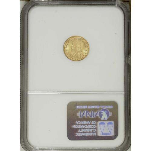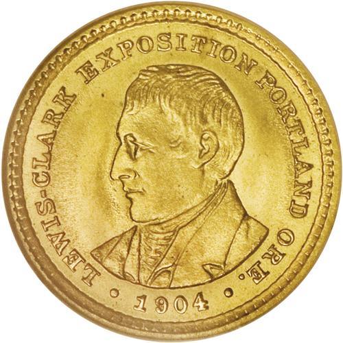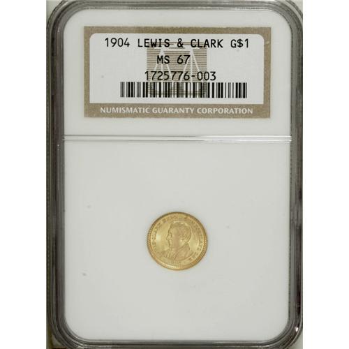 <B>1904 G$1 Lewis and Clark MS67 NGC.</B></I> So...which of the dashing (but unlabeled) portraits represents Lewis, and which is Clark? As Swiatek-Breen put it succinctly: "In this, our nation's only two-headed coin, the obverse is legally the date side, and this side portrays--after a fashion--Captain Meriwether Lewis, who had been Thomas Jefferson's secretary despite his appallingly poor spelling. The side with ONE DOLLAR supposedly portrays Captain William Clark." With that bit of confusion out of the way, this lovely Superb Gem is among the best-preserved survivors of this century-old commemorative. Both wheat-gold sides display strong luster, and the portraits have above-average detail. Only a few tiny marks appear in the fields, and none of these are individually distracting. A great choice for a high-end set of commemorative gold. Census: 19 in 67, 1 finer (11/06).<BR><BR><b>Shipping:</b> Coin/Currency (<a target="_blank" href="http://www.heritageauctions.com/common/shipping.php">view shipping information</a>)