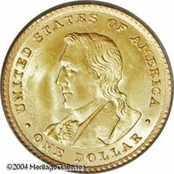 1904 G$1 Lewis and Clark MS67 PCGS. The 1904 Lewis <B>1904 G$1 Lewis and Clark MS67 PCGS.</B></I> The 1904 Lewis and Clark Gold Dollar is one of the most difficult commemorative issues to locate at or above the MS 65 grade level. The present Superb Gem displays blemish-free surfaces that are unbeatable for the issue. Some noticeable metal flow (as struck) shows within the legends on both sides. Swirling mint frost shines through the holder and warm orange-rose overtones are seen overall. Needless to say, this coin is among the finest certified examples available to commemorative specialists. Population: 11 in 67, 0 finer (10/04). <BR><BR><B>Important notice:</B> Heritage usually auctions material at the rate of 200-250 lots per hour. On some occasions eBay Live bid software or the Internet may not be able to keep up with the pace of the auction. We recommend placing a realistic absentee bid now as insurance to avoid disappointment. Occasionally the auctioneer may eliminate or reject an eBay Live bid, and the auctioneer may also reopen a lot after the close of the eBay live bidding (usually because we missed an audience bid), and may reject your bid even if it shows you as the winning bidder. By bidding via eBay Live, you agree that Heritage may award the lot to another bidder at its sole discretion under the circumstances described above or any other reasonable circumstances. Since eBay bids are not shown to us until we open the lot on the floor, we treat those bids just like floor bids. In most cases the floor responds before the eBay bid is presented to us, due to Internet lag time, so for consistency we have made it a policy that floor bids are always considered first over tie eBay live bids. Also please note that all Heritage lots purchased through eBay Live carry a 20% Buyer's Premium. Please make sure you read the Terms and Conditions before you bid. This lot is being auctioned in conjunction with a live floor auction by Heritage Galleries & Auctioneers. All final auction and invoice information will be supplied by Heritage Galleries & Auctioneers, and all other information should be considered preliminary. Lot:7968