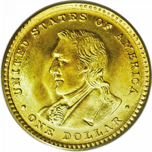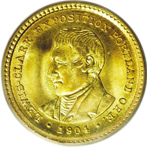 <B>1904<G$1> Lewis and Clark MS68 PCGS.</B></I> Ex: Swiss America/Dr. Merritt. An Act of Congress dated April 13, 1904 called for an exposition to honor Meriwether Lewis and William Clark's 1803-1806 exploration of the U.S. Northwest. Although the Philadelphia Mint produced 25,028 examples in 1904 and a further 35,041 coins in 1905, a number of examples from each year were subsequently melted as unsold. The net mintages of these two issues are 10,025 and 10,041 pieces, respectively. The Lewis and Clark Exposition, held in Portland, Oregon in 1905, is sometimes confused with the Louisiana Purchase Exposition, which took place the year before in St. Louis. What both events have in common is that their gold commemorative issues were sold on the fair grounds by Farran Zerbe. Zerbe offered the Lewis and Clark pieces for $2 each, a reduction from the $3 price for the 1903 Louisiana Purchase issues. Zerbe also took his formidable coin collection to the Portland exposition, where it was displayed in the Manufacturers Building. He was not the first to offer the Lewis and Clark pieces, however, since Portland dealer D.M. Averill somehow obtained a quantity and advertised them for sale in the April 1905 <I>Numismatist,</B></I> two months prior to the opening of the exposition.<BR> This radiantly frosty Superb Gem offers splendid, dazzling luster and lovely olive-gold coloration. In addition to razor-sharp design details, the piece displays impeccably preserved surfaces that are virtually flawless, allowing for slight evidence of mint-made die polish in the fields, and a wispy lintmark (as struck) that extends from 7 o'clock on the reverse rim onto Clark's bust. The overall technical merit and beauty of this piece testify to its status as simply the finest-known example of the 1904 Lewis and Clark Commemorative gold dollar. Population: 1 in 68, 0 finer (4/06).