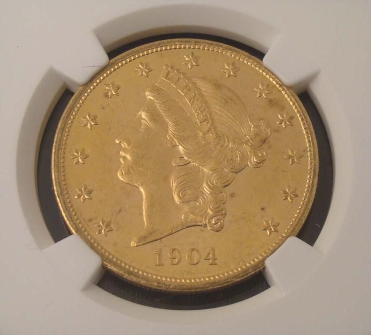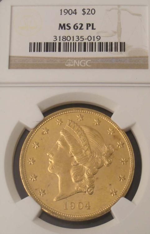 1904 Gold $20 Liberty Coin * Grade: MS 62 PLGraded by: Numismatic Guaranty Corporation