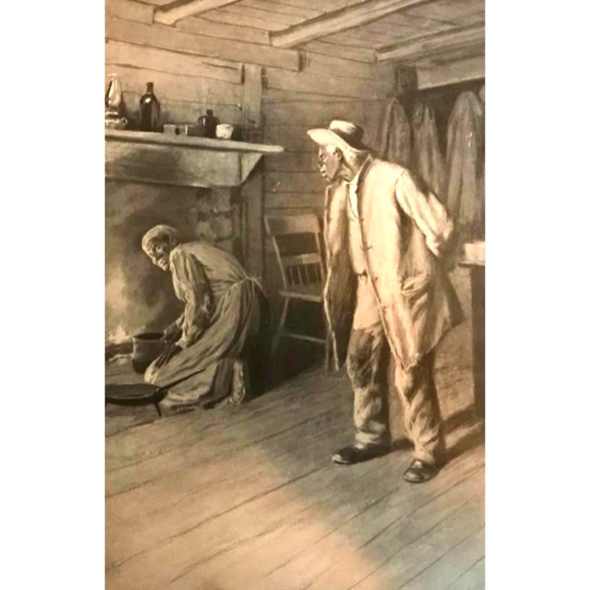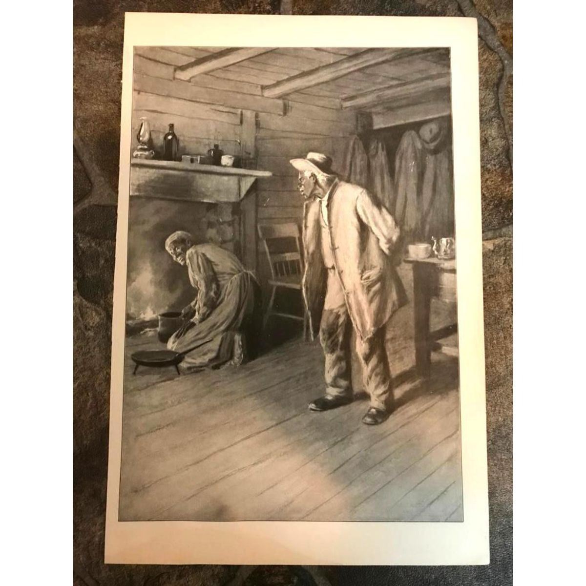 1904 half-tone print from "A Book of Drawings by A.B. Frost". African American subject of the day, depicts the interior of a cabin with a woman cooking over a fire.  10" X 15".