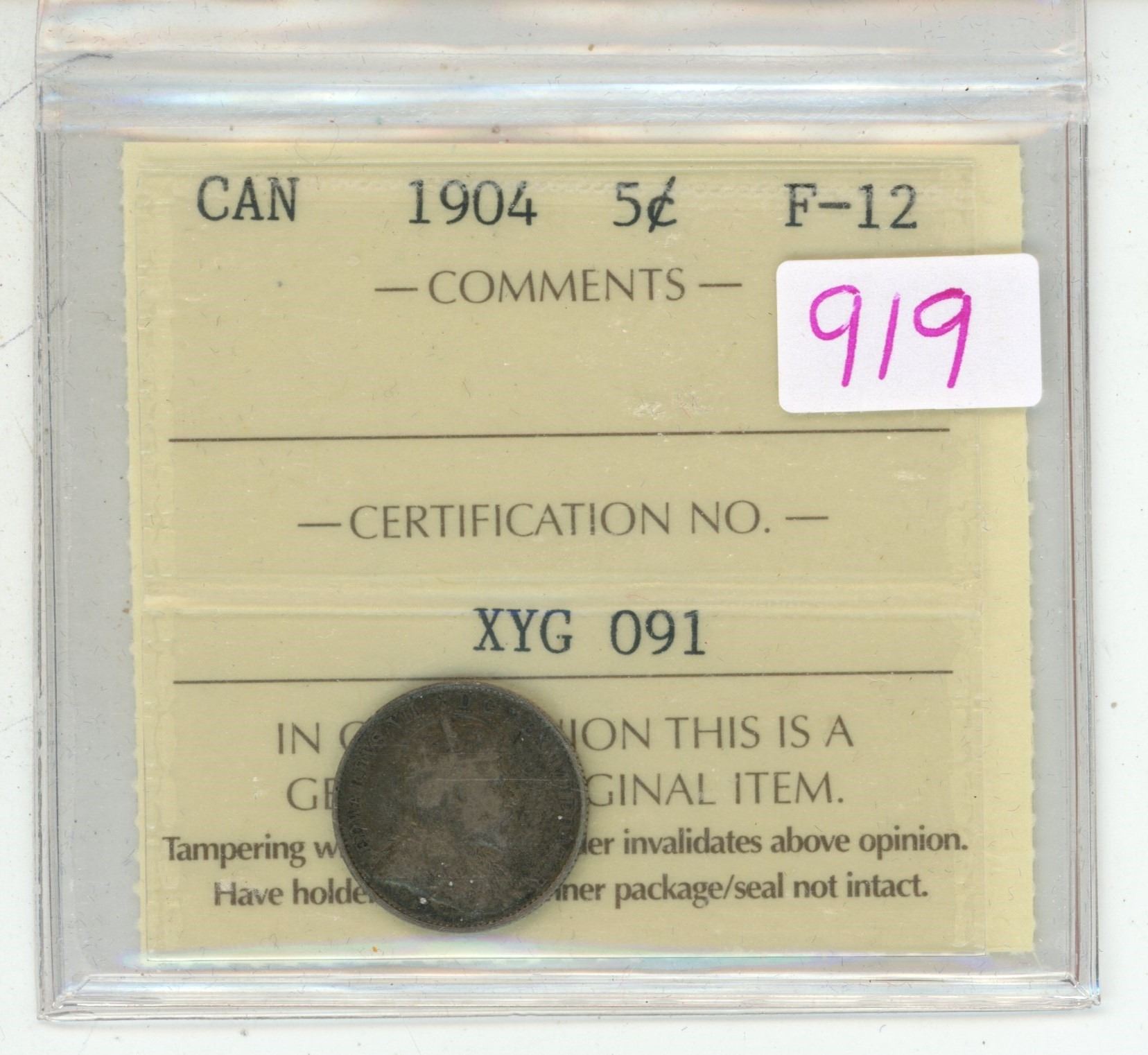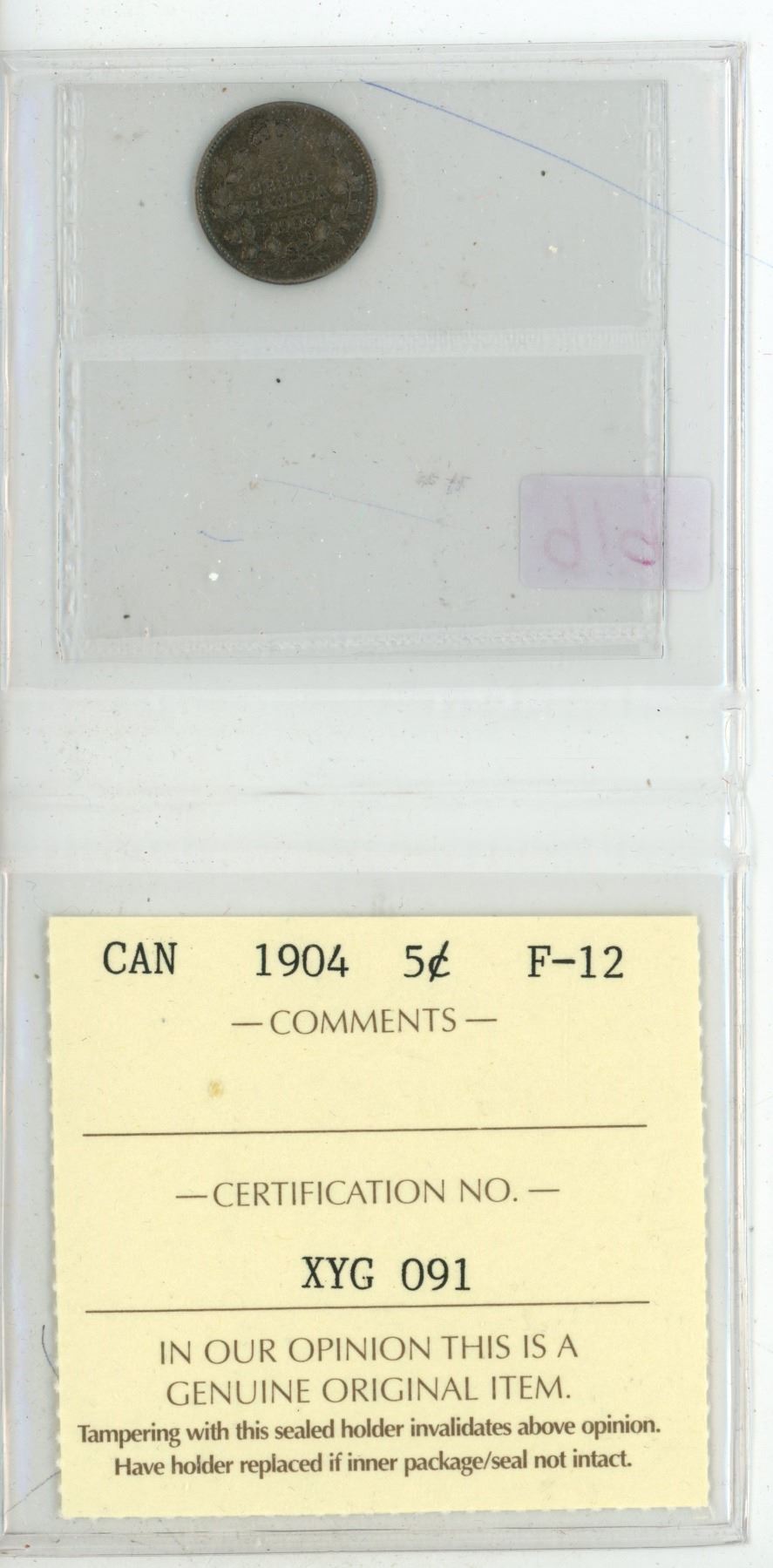 1904 ICCS graded, Canadian silver 5 cent coin - F12