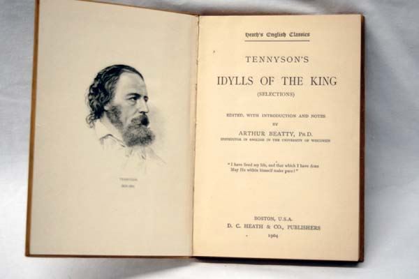 1904 Idylls of the King by Tennyson, Edited by Arthur Beatty, c. 1904 D.C. Heath & Co., Publishers Boston, U.S.A. 150pgs., the very 1st page has slight separation from the spine, written inside on 1st page reads ''Thalia Winchell Senior Year 1906''