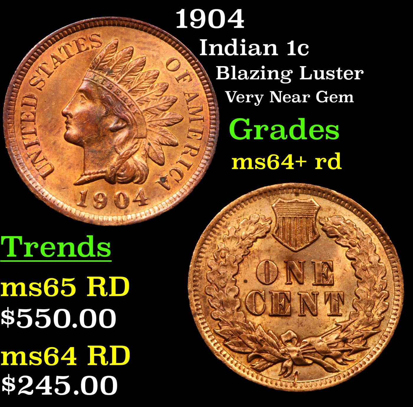 1904 Indian Cent 1c Grades Choice+ Unc RD.