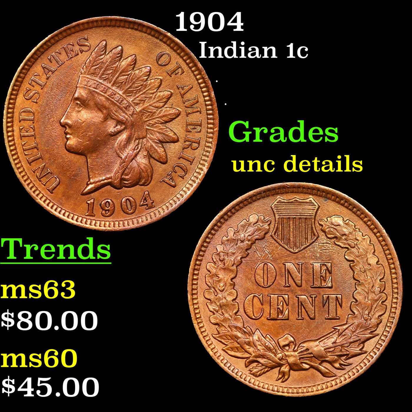 1904 Indian Cent 1c Grades Unc Details.