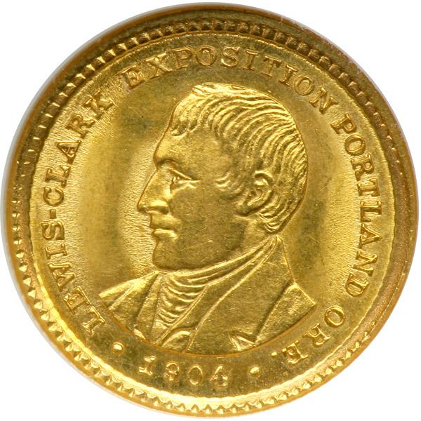 1904 Lewis and Clark Gold Dollar. NGC graded MS-65. Well struck and fully lustrous, untoned. A gem example. Due to the market shenanigans by Farran Zerbe relating to the 1903 Louisiana Purchase Exposition gold dollars and the consequent market bust, collectors had very little interest in the subsequent Lewis and Clark gold dollars, as here, issued in Portland, Oregon, with dates of 1904 and 1905. Those that were sold mainly went to the public and were not handled with care. Today the 1904 and 1905 Lewis and Clark dollars are several times rarer in Gem Mint State grades than are the other pairs of commemorative gold dollars -- the 1903 Louisiana Purchase, the 1916 and 1917 McKinley, and the 1922 Grant varieties. Pop 183; 139 finer (PCGS # 7447) .