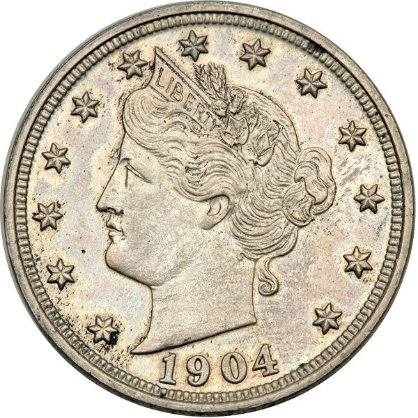 1904 Liberty Nickel. PCGS graded Proof 63. Lovely natural pinkish-grey toning with some flyspecks. Only 1817 proofs struck (PCGS # 3902) .
