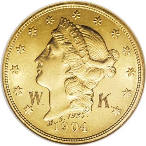 <B>1904 Liberty Double Eagle, MS60 ANACS.</B></I> This is an expertly hand-engraved love token or presentation piece that has the letters W.K. on Liberty's bust. The date 31.5.1925 is engraved between the bottom of the bust and the date. The insert uses the word "graffiti," which implies scratches. This is far from random scratches, but rather the work of a craftsman. A great addition to a love token collection.<BR><BR><b>Shipping:</b> Coin/Currency (<a target="_blank" href="http://www.heritageauctions.com/common/shipping.php">view shipping information</a>)