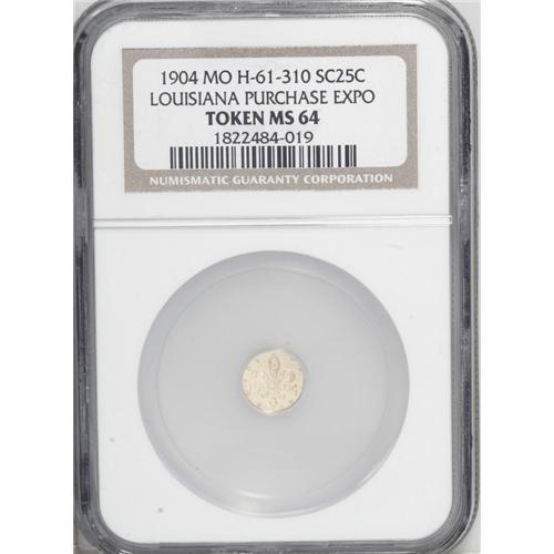 <B>1904 Louisiana Exposition 1/4 Dollar Gold,</B></I> MS64 NGC, On the obverse a fleur-de-lis in the center, on the leaves of which are inscribed the letters: L P E. ( Louisiana Purchase Exposition). Below on the stem is the initial ( Z ) for Zerbe. This is the 10 stars around the Fleur-de-lis varitiey. This is a rare opportunity to acquire a very tough token to find in any condition let alone MS64. This piece is listed on page 29 of the 1979 catalog Meet Me in St. Louie, by Kurt Krueger catalog number 362.