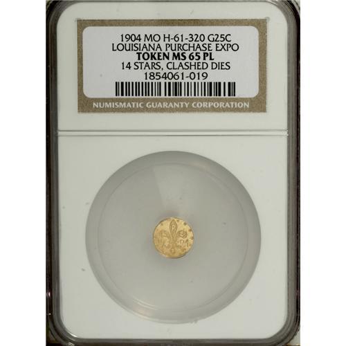 <B>1904 Louisiana Purchase Expo 1/4 Gold MS65 Prooflike NGC.</B></I> 14 stars. Hendershott-61-320. A prooflike Gem struck from heavily clashed dies. Obverse strike-throughs (as made) are present beneath the 0 in the date and at 11:30. Farran Zerbe, a leading coin dealer in 1904, sold these and similar gold tokens on the grounds of the exposition, which also staged the 1904 Summer Olympics.<BR><BR><b>Shipping:</b> Coins & Currency (<a target="_blank" href="http://www.heritageauctions.com/common/shipping.php">view shipping information</a>)