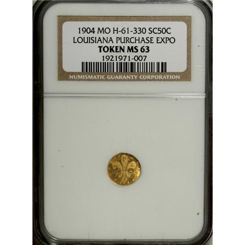 <B>1904 Louisiana Purchase Exposition Half Dollar Gold MS63 NGC.</B></I> H-61-330. On the obverse is a fleur-de-lis with the letters L P E (Louisiana Purchase Exposition) on the leaves. Below and on the stem is the initial (Z) for Zerbe. This is the large 1/2 and 14 star variety. An opportunity to obtain a very scarce souvenir of the St. Louis World's Fair.<BR><BR><b>Shipping:</b> Coin/Currency (<a target="_blank" href="http://www.heritageauctions.com/common/shipping.php">view shipping information</a>)