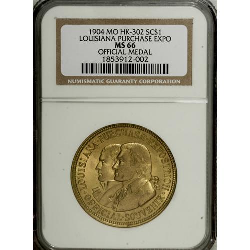 <B>1904 Louisiana Purchase Exposition MS66 NGC.</B></I> HK-302. Yellow bronze. This brassy example is lustrous and unabraded, and remains essentially as struck, more than one century ago. Only slight softness on the devices, notably the cheek, prevents an even finer numerical grade. Census: 1 in 66, 1 finer (12/06).<BR><BR><b>Shipping:</b> Coins & Currency (<a target="_blank" href="http://www.heritageauctions.com/common/shipping.php">view shipping information</a>)